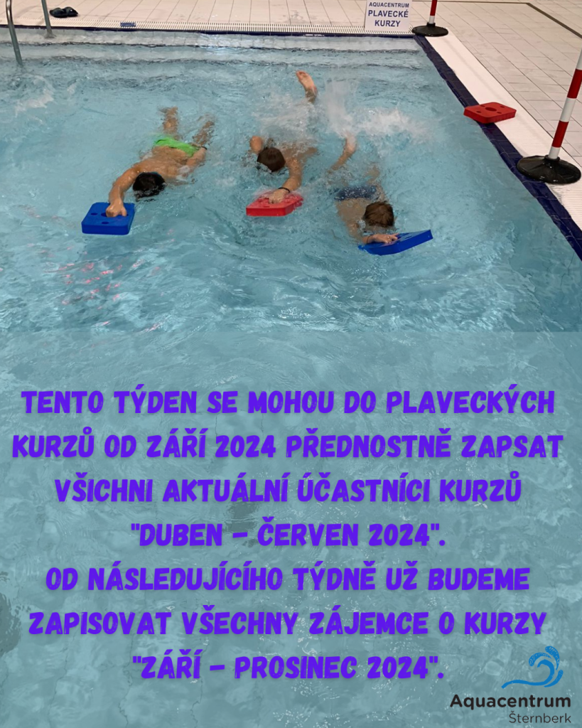 V týdnu od 3. 6. do 9. 6. se mohou do plaveckých kurzů od září 2024 přednostně zapsat všichni aktuální účastníci kurzů "duben - červen 2024". Od 10. 6. už budeme zapisovat všechny zájemce o kurzy "září - prosinec 2024".
